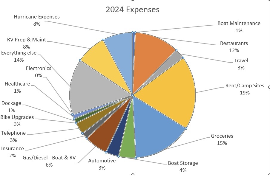- Dockage, “Everything else”, and healthcare were consistent with last year, but RV maintenance did go up. We spent a bit of money replacing our clothing & shoes before leaving this year but thankfully no hurricane expenses!
