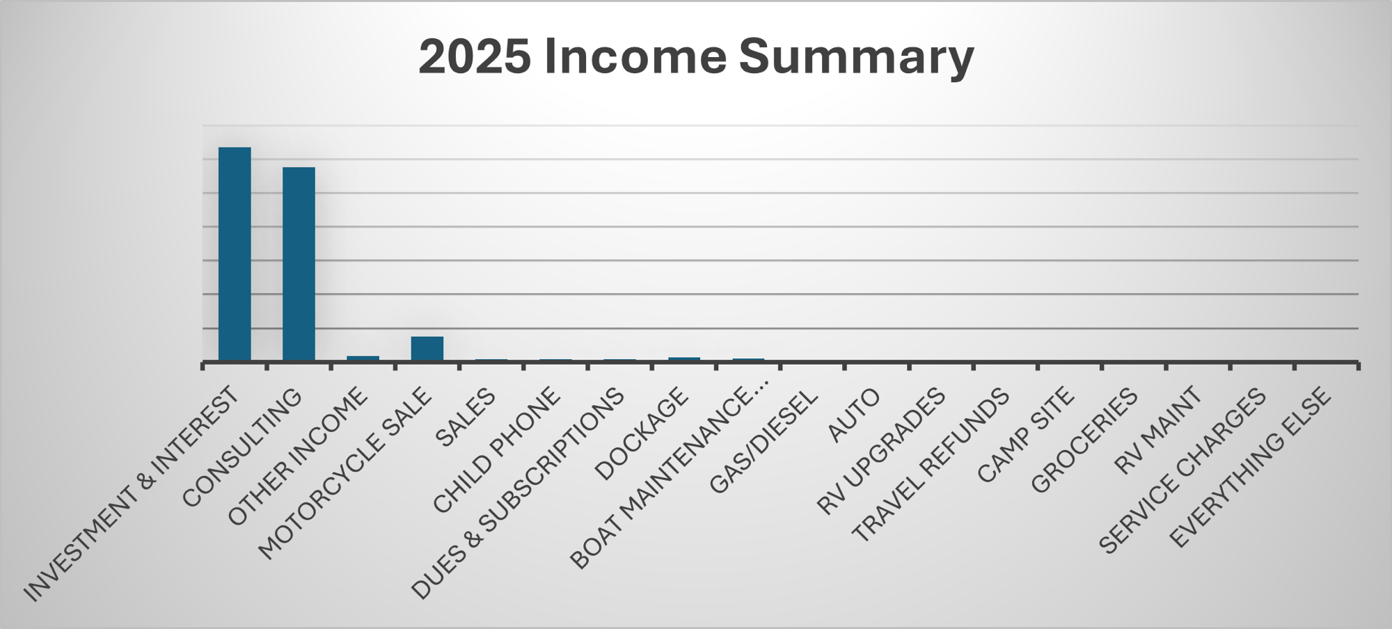 Let’s start with our income. Ron and I still make money through our investments, which includes dividends, interest, etc. This was our highest earning category this year. Secondly, was Ron consulting gig. New this year was the income we got from selling the motorcycle. The last category was a fraction but included everything else.
