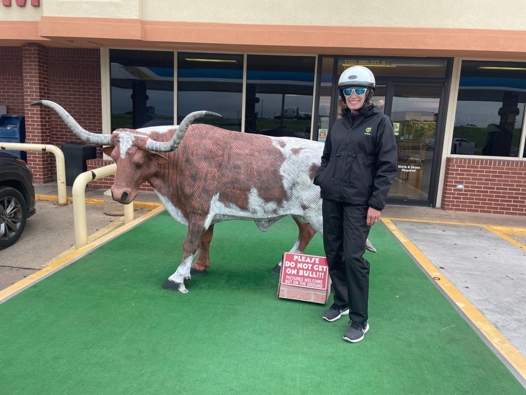 We awoke the next morning to a cloudy cold day and not 20 minutes into the ride, my wish came true. It started to rain. We donned our rainsuits, said goodbye to the bull at Jolly’s, and braved the storm on our way to Amarillo to stay the night. I am getting better by the way. I got the rain suit on and off by myself this time…just not gracefully.