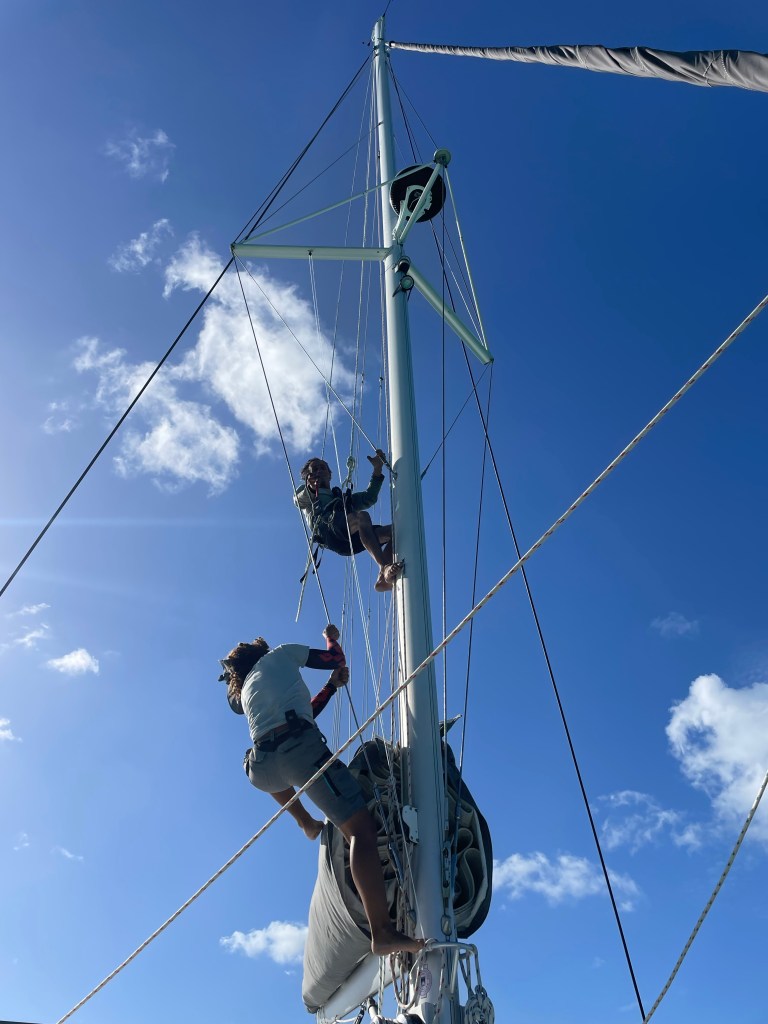 This included them reviewing all our running rigging, Ron’s new re-rig of the main sail to be operated from the helm and take a run up the mast. This is a job Ron hates to do and was well worth the money to have done. Good news is they didn’t find any major issues even after the rough sailing we through the thorny path.